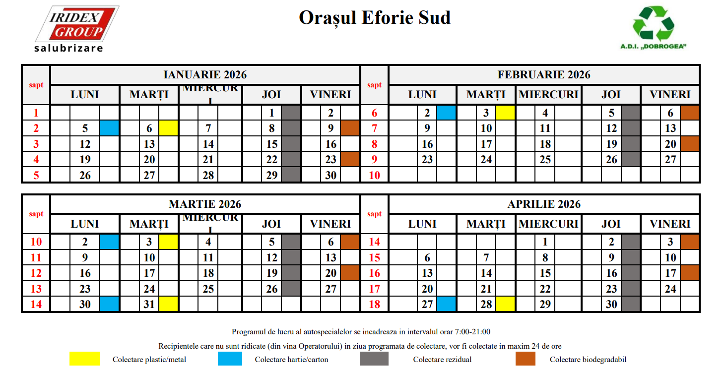 Calendar colectare deșeuri menajere – Eforie Sud (Ianuarie–Aprilie 2026)