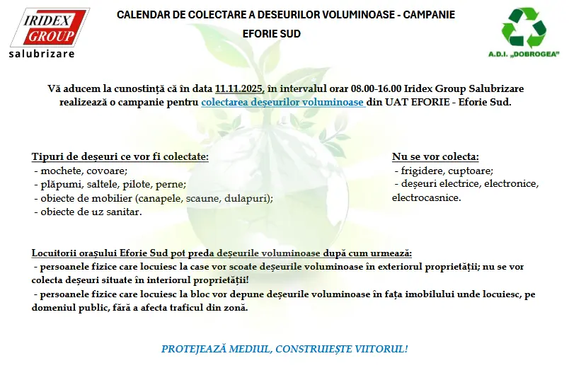 Vă aducem la cunoștință că în data 11.11.2025, în intervalul orar 08.00-16.00 Iridex Group Salubrizare realizează o campanie pentru colectarea deșeurilor voluminoase din UAT EFORIE – Eforie Sud.