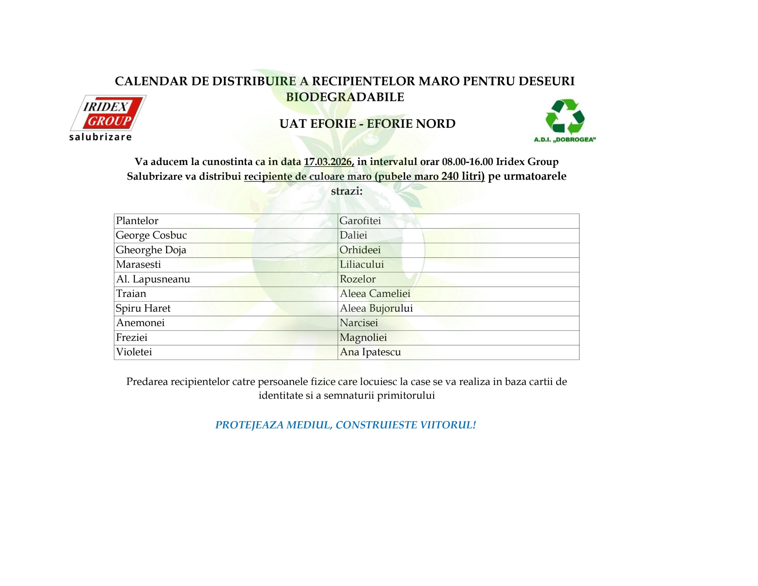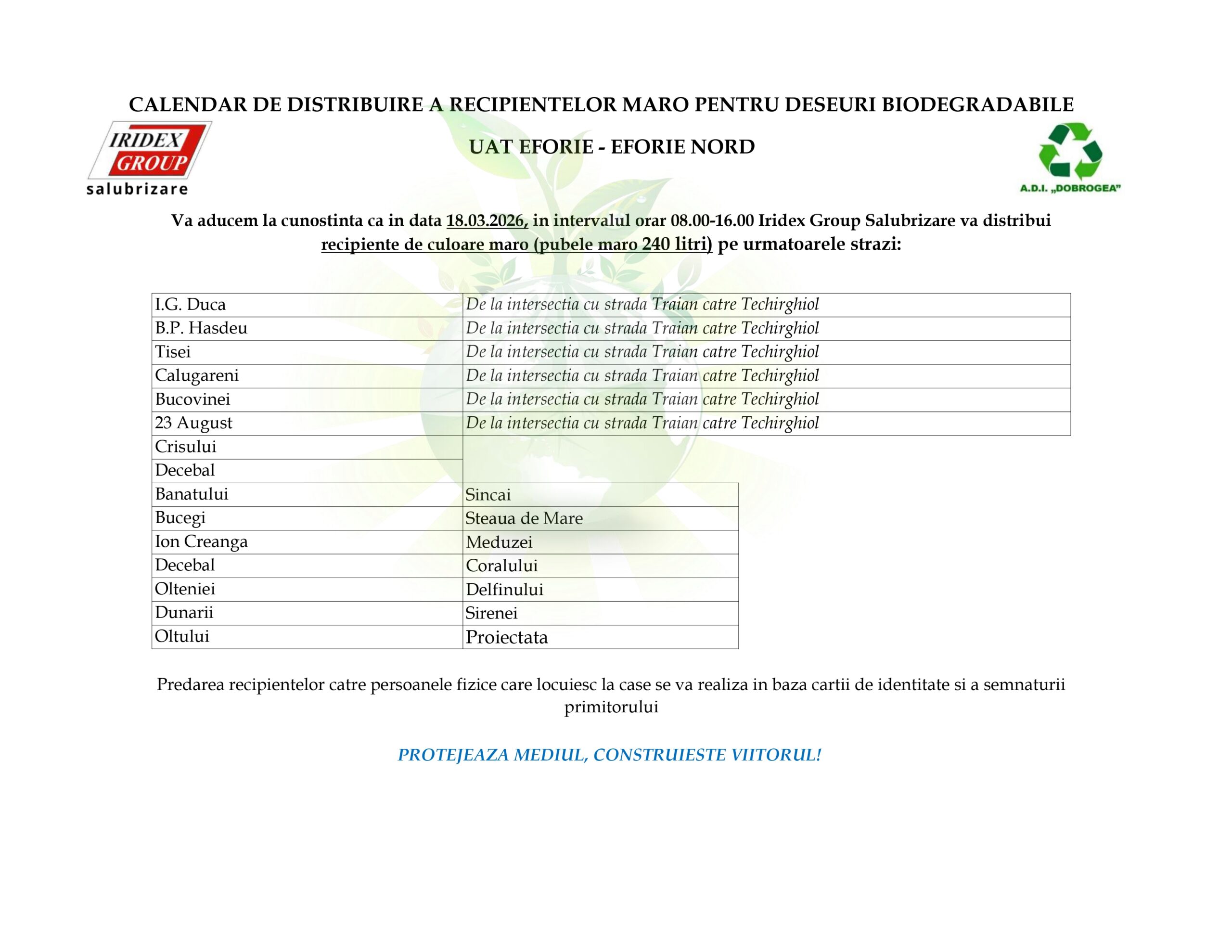 CALENDAR DE DISTRIBUIRE A RECIPIENTELOR MARO PENTRU DESEURI BIODEGRADABILE UAT EFORIE – EFORIE NORD