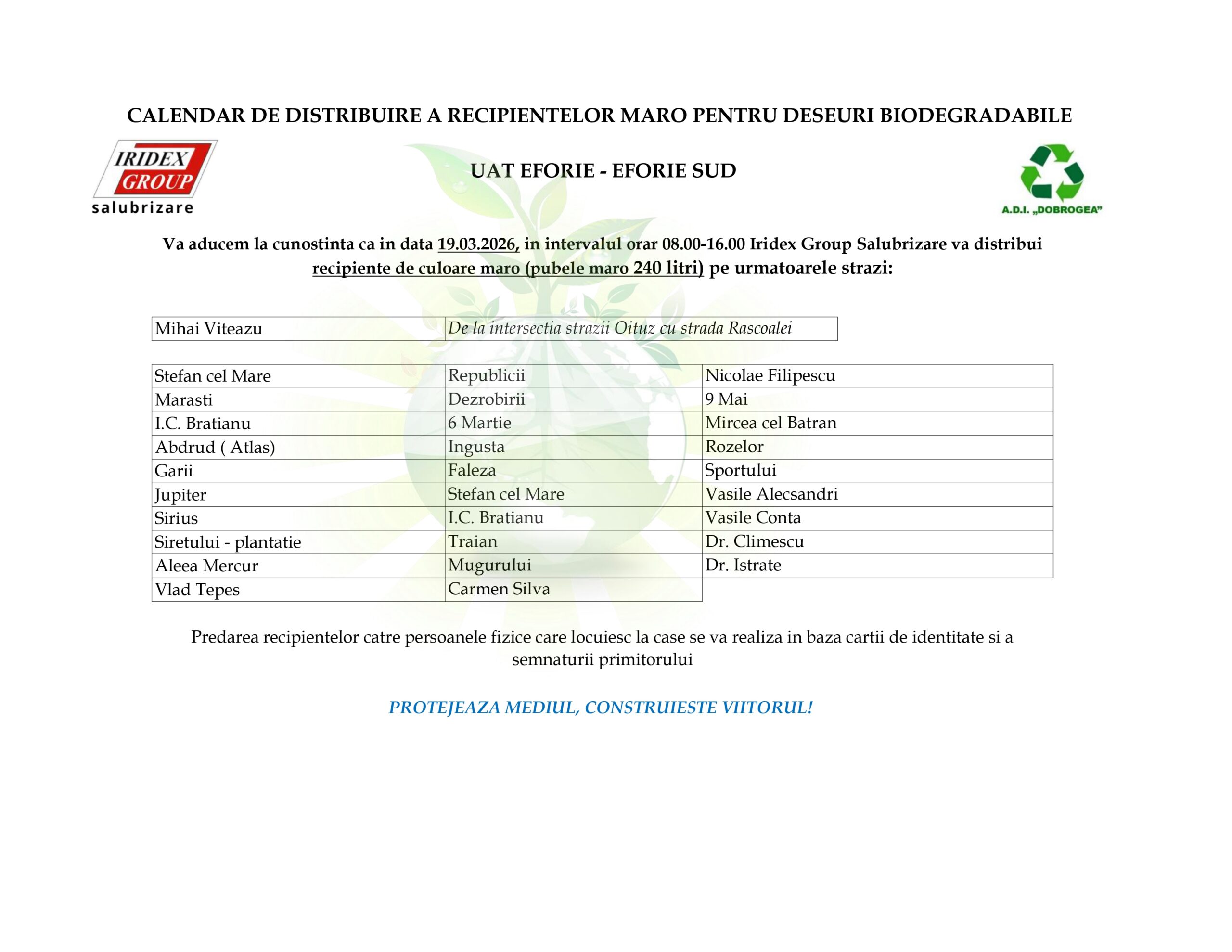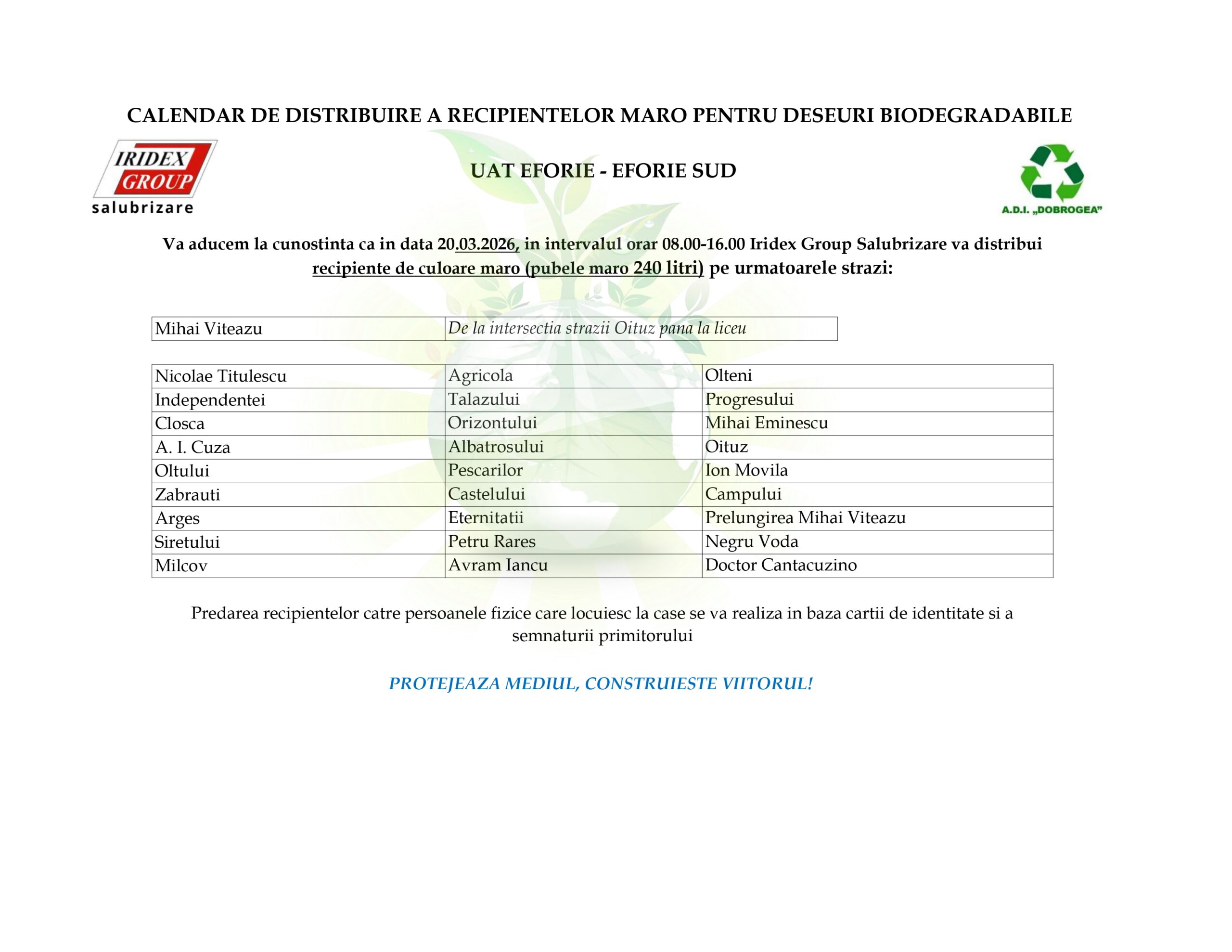 CALENDAR DE DISTRIBUIRE A RECIPIENTELOR MARO PENTRU DESEURI BIODEGRADABILE UAT EFORIE – EFORIE SUD